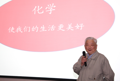 陸熙炎院士和呂龍研究員為本次活動精心準備了科普報告。陸院士以《化學使我們的生活更美好》為題做專題報告,結合生活中的實例,生動地詮釋了化學對人類“衣、食、住、行”的貢獻,并對同學們提出了熱愛化學、認知化學,用化學創(chuàng)造我們更加美好的生活的殷切期望。隨后,呂龍研究員做《化學與航天》專題報告,通過介紹航天的發(fā)展歷程和航天的動力裝置,讓大家認識到化學不僅僅能使我們的生活更美好,而且化學也與國家航天事業(yè)緊密相關。呂龍研究員鼓勵同學們向老一輩科學家學習,今后能積極投身到神圣的化學事業(yè)中去。在認真聆聽報告后,同學們與兩位主講人進行了問答互動,場面十分熱烈。