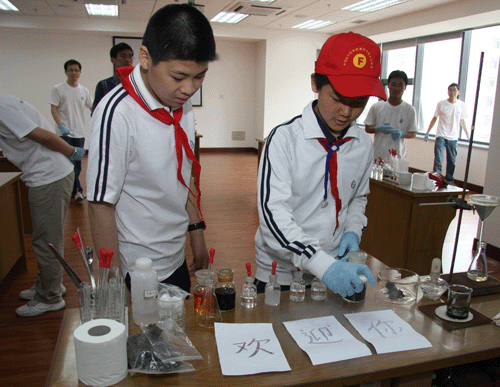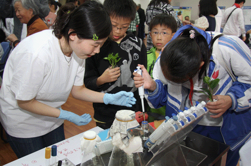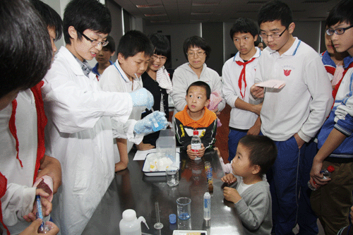 科普專題講座結束后,來訪者在志愿者的引導下分批分別參觀了金屬有機化學國家重點實驗室、生命有機化學國家重點實驗室、中國科學院天然產(chǎn)物有機化學重點實驗室、中國科學院有機氟化學重點實驗室和上海有機所高分子材料研究室集中展示廳。各展廳通過視頻、幻燈片、展板、趣味化學實驗等多種形式向公眾展示了各研究室所涉及的領域及化學與人類生活之間千絲萬縷的聯(lián)系。由各研究室研究員、職工和研究生組成的志愿者們通過耐心講解和示范,生動地揭示了化學世界的奧妙,來訪者興趣盎然、熱情高漲,化學反應過程中產(chǎn)生的顏色和物質(zhì)形態(tài)的變化喚起了大家強烈的興趣和好奇心。許多同學迫切地想要走進奇妙的化學世界,興致勃勃地自己動手操作起小實驗,體會其中的樂趣所在。