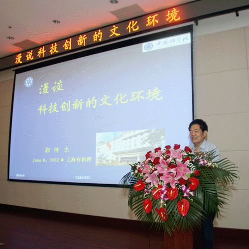 6月6日上午,上海有機所隆重舉辦了“黃耀曾科學(xué)與人文講座”首場報告會,特邀中科院原黨組副書記、中科大黨委書記郭傳杰研究員做了題為“漫談科技創(chuàng)新的文化環(huán)境”的報告,報告會由黨委書記郟靜芳主持,有機所院士、領(lǐng)導(dǎo)班子成員、科研骨干、管理骨干、學(xué)生等200余人參加了報告會。