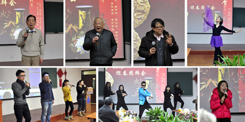 接下來余冰同志主持了文藝表演,機(jī)關(guān)年青同志以一組《祝福你》合唱正式拉開了團(tuán)拜會(huì)文藝演出序幕。演出中老同志和年青同志進(jìn)行了互動(dòng),退休職工張立真同志為大家表演了舞蹈《梁?!?、老教授陳海寶為大家演唱了一首《紅梅贊》、老領(lǐng)導(dǎo)姚介興為大家演唱了一首解放區(qū)名歌《山那邊好地方》、機(jī)關(guān)章云帆等五位年青同志為大家表演了騎馬舞,最后新年團(tuán)拜會(huì)在余冰《鳳陽花鼓》的獨(dú)唱聲中落下了帷幕。