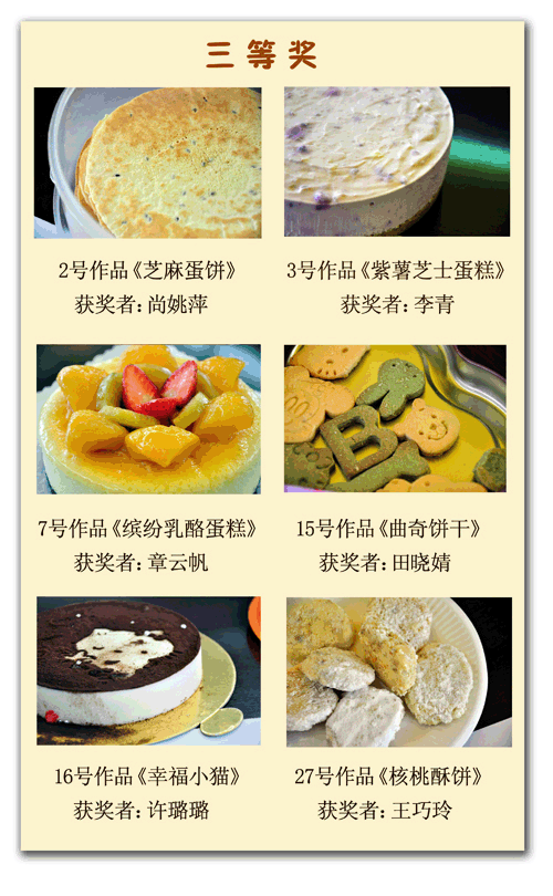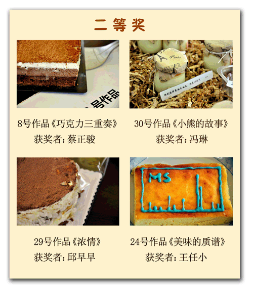 在比賽現場,評委和在場的職工拍照的拍照,發(fā)微博的發(fā)微博,場面非常熱鬧。戴立信院士作為評委之一,神情認真的在評分表中對每個作品寫出了“外形最優(yōu)”、“可口可愛”、“健康可口”、“經濟適用”等點評語。最終本次創(chuàng)意點心烘焙大賽,評出了一等獎2名,分別是13號作品《寵愛》及23號作品《提拉米蘇》,二等獎4名,分別是8號作品《巧克力三重奏》、24號作品《美味的質譜》、29號作品《濃情》及30號作品《小熊的故事》,三等獎6名,分別是2號作品《芝麻蛋餅》、3號作品《紫薯芝士蛋糕》、7號作品《繽紛乳酪蛋糕》、15號作品《曲奇餅干》、16號作品《幸福小貓》及27號作品《核桃酥餅》。