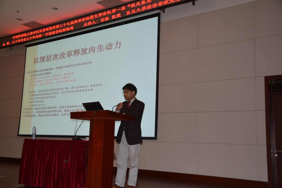 11月14日晚,由上海有機(jī)所學(xué)生會(huì)和有機(jī)氟化學(xué)黨支部聯(lián)合主辦的上海有機(jī)所第二十七屆楓林論壇暨元素有機(jī)第一屆“微風(fēng)氟來”講壇在君謀樓一樓報(bào)告廳舉行。本次論壇邀請(qǐng)了復(fù)旦大學(xué)經(jīng)濟(jì)學(xué)院黨委書記石磊教授作題為“三十年河?xùn)|,三十年河西—中國(guó)經(jīng)濟(jì)新格局”的專題報(bào)告。報(bào)告由上海有機(jī)所黨委副書記胡金波主持。