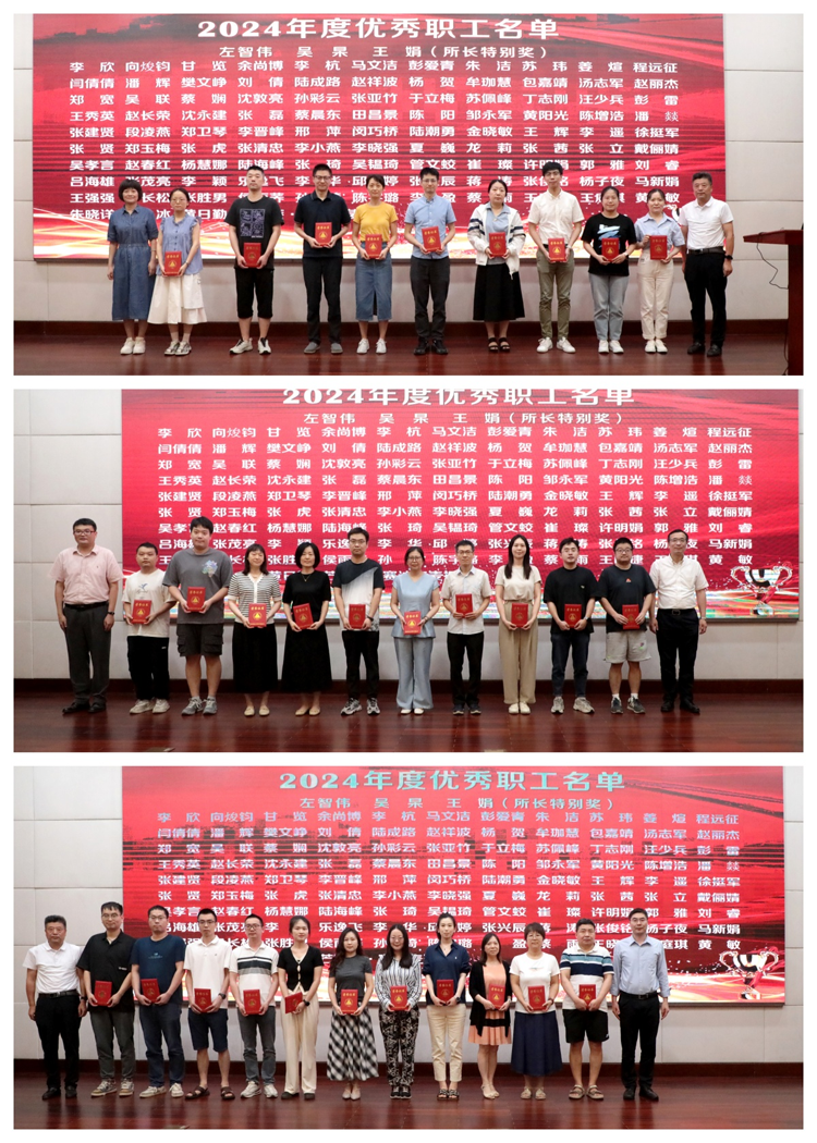 ????職代會(huì)上還舉行了頒獎(jiǎng)儀式,人力資源處副處長(主持工作)蔣詠文宣讀了2024年度優(yōu)秀職工獲表彰名單。所長、黨委書記胡金波,副所長劉菲,副所長、黨委副書記李昂,紀(jì)委書記石巖森、工會(huì)主席張新剛共同為2024年度優(yōu)秀職工頒發(fā)了榮譽(yù)證書。