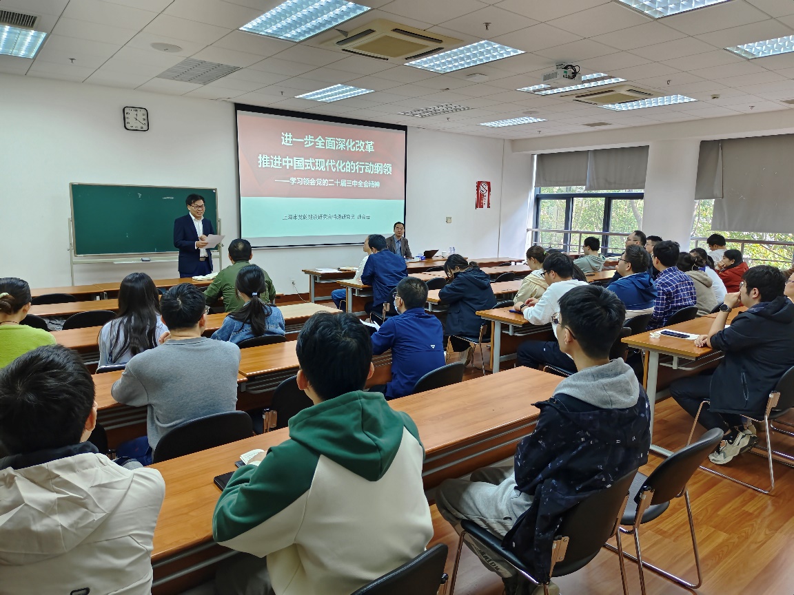 孫教授以通俗易懂的方式闡述了全面深化改革的重大意義、總體要求以及推進(jìn)中國(guó)式現(xiàn)代化的具體行動(dòng)綱領(lǐng),著重強(qiáng)調(diào)了改革的“為什么”、“改什么”和“怎么辦”三個(gè)核心問(wèn)題。從進(jìn)一步全面深化改革的重大意義和總體要求、聚焦重點(diǎn)在更高水平上進(jìn)一步全面深化改革、提高黨對(duì)進(jìn)一步全面深化改革的領(lǐng)導(dǎo)水平三個(gè)方面,對(duì)全會(huì)精神進(jìn)行了系統(tǒng)且深入的宣講與闡述。此外,他還強(qiáng)調(diào)個(gè)人的成長(zhǎng)與國(guó)家的發(fā)展的相似性——需要具備戰(zhàn)略思維及系統(tǒng)思維,面對(duì)人生的戰(zhàn)略交匯點(diǎn),要依靠加強(qiáng)自身的確定性應(yīng)對(duì)外界的不確定性,對(duì)大家進(jìn)一步靜心開(kāi)展科研創(chuàng)新工作提供了有益指導(dǎo)。