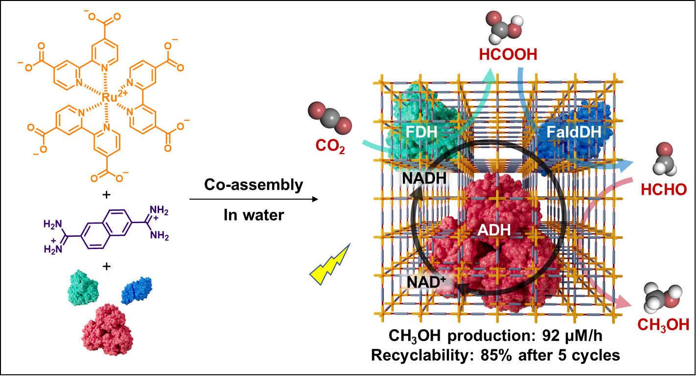該工作受羧酶體啟發(fā),通過水相中基于氫鍵相互作用的自組裝,利用脒基單體、羧基單體與甲酸脫氫酶(FDH)、甲醛脫氫酶(FaldDH)及醇脫氫酶(ADH)的電荷增強氫鍵,原位一鍋法共組裝實現(xiàn)基于多酶-光活性框架體系的人工光合系統(tǒng)制備?;诼?lián)吡啶釕基元的氫鍵有機框架富集了光催化活性中心,能夠在水相條件下實現(xiàn)高效的輔酶因子NAD+還原進而再生NADH, 還原速率達到4.5 mM/h。進一步,通過與FDH 的整合,利用光活性框架再生NADH以推動FDH持續(xù)消耗NADH還原二氧化碳, 進而實現(xiàn)高效的光催化二氧化碳還原制備甲酸?;诠獯呋稽c與酶催化位點拉近效應,增強了光合體系催化制備甲酸的活性,催化HCOOH轉化頻率(TOF)能夠達到681 h-1。此外,通過整合FDH、FaldDH和ADH三酶級聯(lián)體系,實現(xiàn)多種蛋白共組裝到框架中。通過共聚焦顯微鏡實驗證明了三種蛋白在框架內部的均一性封裝,同時,基于光酶級聯(lián)催化位點拉近效應,實現(xiàn)了高效光催化酶級聯(lián)反應還原二氧化碳逐步至甲酸、甲醛到甲醇,其制備甲醇的效率達到92 μM/h, 表觀光量子效率達到5.5%,同時經(jīng)過5次催化循環(huán)仍然保持85%催化活性。該模擬天然羧酶體結構的研究提供了一種整合光催化與多酶級聯(lián)催化構筑高效人工光合系統(tǒng)的新思路,為進一步利用高效光-酶級聯(lián)體系實現(xiàn)二氧化碳還原到高價值多碳產物鋪平了道路。