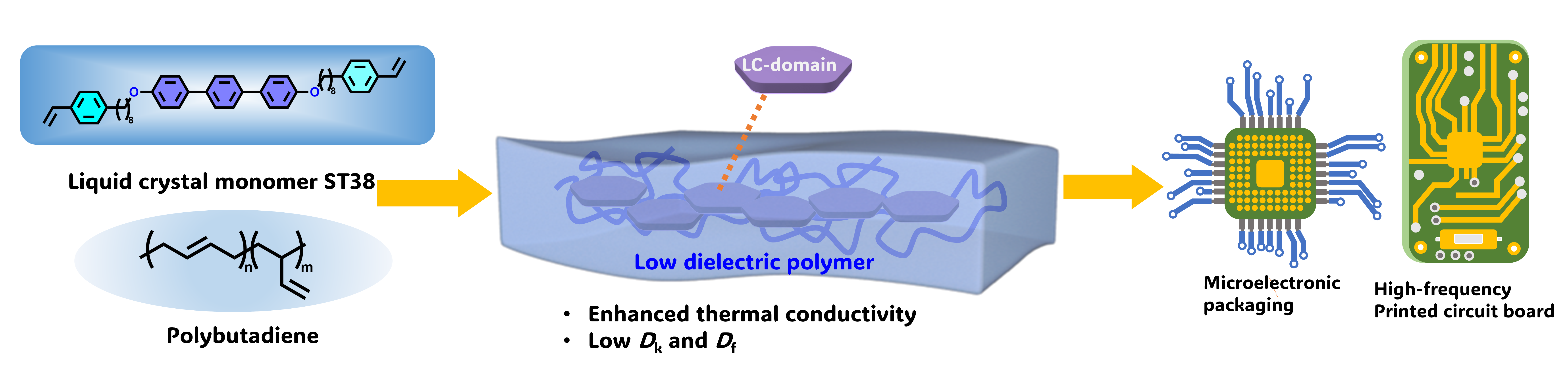 高頻通信和人工智能的迅速發(fā)展推動(dòng)了微電子器件向著高速傳輸,集成化和小型化方向發(fā)展。然而,電子器件性能的提升也同時(shí)帶來了電子串?dāng)_、阻-容延遲和熱量積累等問題。為了解決這些問題,需要電介質(zhì)材料具有低介電常數(shù)(Dk)和低介電損耗(Df)以及高導(dǎo)熱率,以確保信號(hào)傳輸?shù)乃俣群唾|(zhì)量,并同時(shí)提高散熱性,延長(zhǎng)器件的使用壽命。然而,如何實(shí)現(xiàn)材料兼具低介電和高導(dǎo)熱的特性仍是一大挑戰(zhàn)。中國(guó)科學(xué)院上海有機(jī)化學(xué)研究所房強(qiáng)課題組長(zhǎng)期開展低介電常數(shù)材料的研究,近期在Advanced Materials雜志發(fā)表題為Enhancing Thermal Conductivity in Low Dielectric Polybutadiene via a Liquid Crystal Ordering Effect (https://doi.org/10.1002/adma.202517027) 的論文,利用液晶有序效應(yīng)提升了聚丁二烯的導(dǎo)熱性能,制備了導(dǎo)熱性能良好的低介電液晶聚合物。