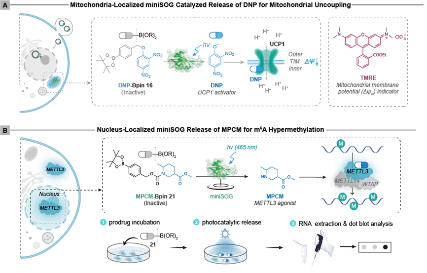 近日,中國科學(xué)院上海有機化學(xué)研究所生命過程小分子調(diào)控全國重點實驗室陳以昀研究員團(tuán)隊在生物正交光調(diào)控研究領(lǐng)域取得重要進(jìn)展。團(tuán)隊構(gòu)建了僅12 kDa的微型光酶miniSOG可見光調(diào)控平臺,成功實現(xiàn)活細(xì)胞內(nèi)細(xì)胞器特異性的可見光精準(zhǔn)時空調(diào)控。該技術(shù)通過原創(chuàng)的“生物正交可見光脫硼羥基化反應(yīng)”,在亞細(xì)胞尺度上精準(zhǔn)操控線粒體膜電位與細(xì)胞核表觀遺傳修飾,突破傳統(tǒng)光調(diào)控技術(shù)背景干擾大、操作復(fù)雜和細(xì)胞功能擾動等瓶頸。相關(guān)成果發(fā)表于《德國應(yīng)用化學(xué)》并被編輯部遴選為Hot Paper(Angew. Chem. Int. Ed. 2025, doi: 10.1002/anie.202515137)。